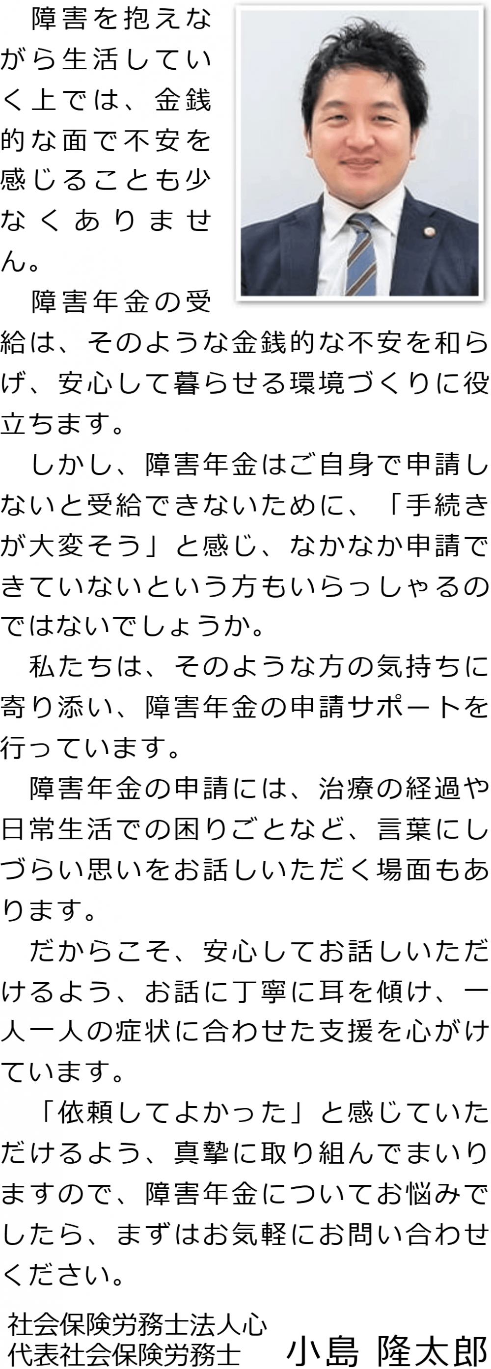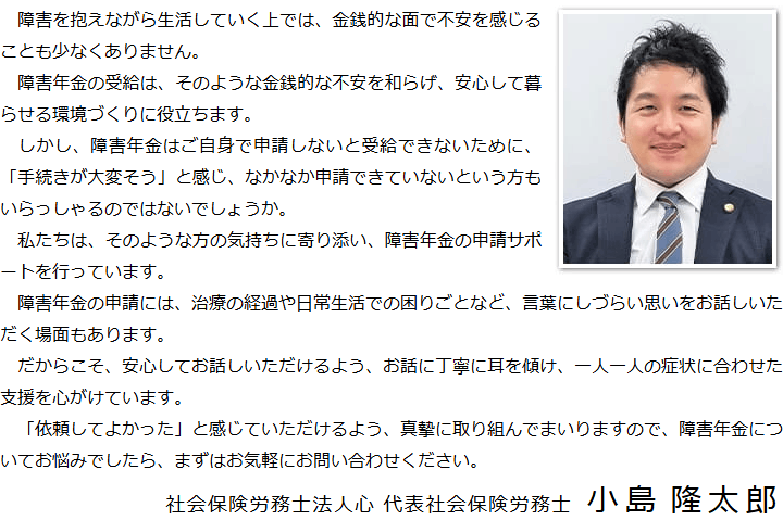トップその他代表メッセージ 階層構造▼ その他(目次) 代表メッセージ その他(目次)その他トップ共通バナー※消さない障害年金無料診断サービス初めて障害年金を申請の方へ手続きの流れ代表メッセージ電話・テレビ電話相談について電話・テレビ電話相談の流れ心グループニュース(新着情報)お客様相談室費用の安さにこだわる理由関連リンクプライバシーポリシー 受付時間 平日 9時~21時、土日祝 9時~18時 夜間・土日祝の相談も対応します (要予約) 所在地 〒271-0092 千葉県松戸市松戸1281‐29京阪松戸ビル3F 0120-25-2403 お問合せ・アクセス・地図
